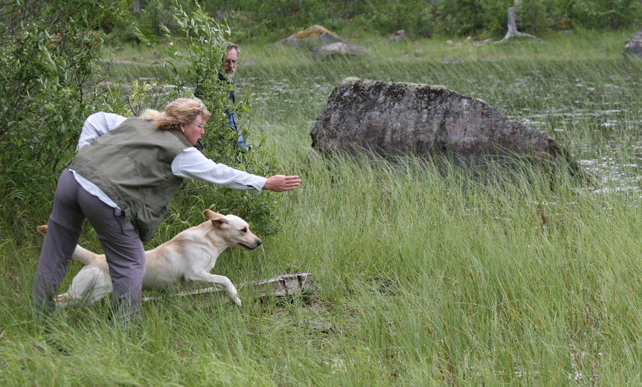 Vi kommer visa olika övningar med linjetag, olika avstånd och svårigheter. Hur du ska tänka och hur ska kunna hjälpa dig hund att komma till rätt område. Närsöks-signal kommer också att tränas på under dagen. Viktig bit eftersom hunden ska kunna signalen och du ska hjälpa hunden och tala om att den är i rätt område. Har din hund lite mera kunskap och erfarenhet så kommer vi göra svårare övningar och med mera störningar Skott och skytt kommer att finnas på kursen